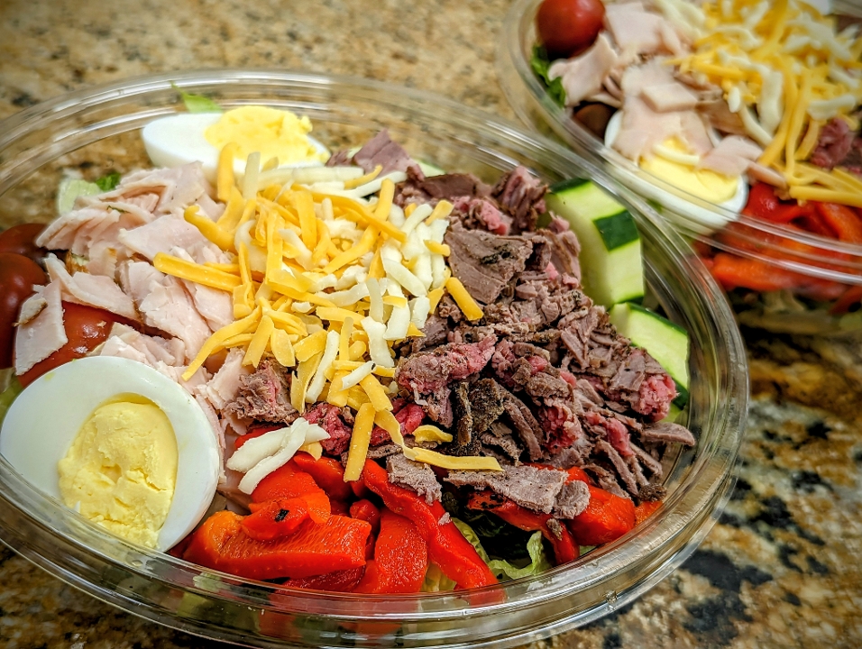 TOSSED SALAD WITH ALL THE FIXINS PLUS TURKEY, ROAST BEEF, SHREDDED MOZZ, AND HARD BOILED EGGS. CHOICE OF DRESSING ON THE SIDE.