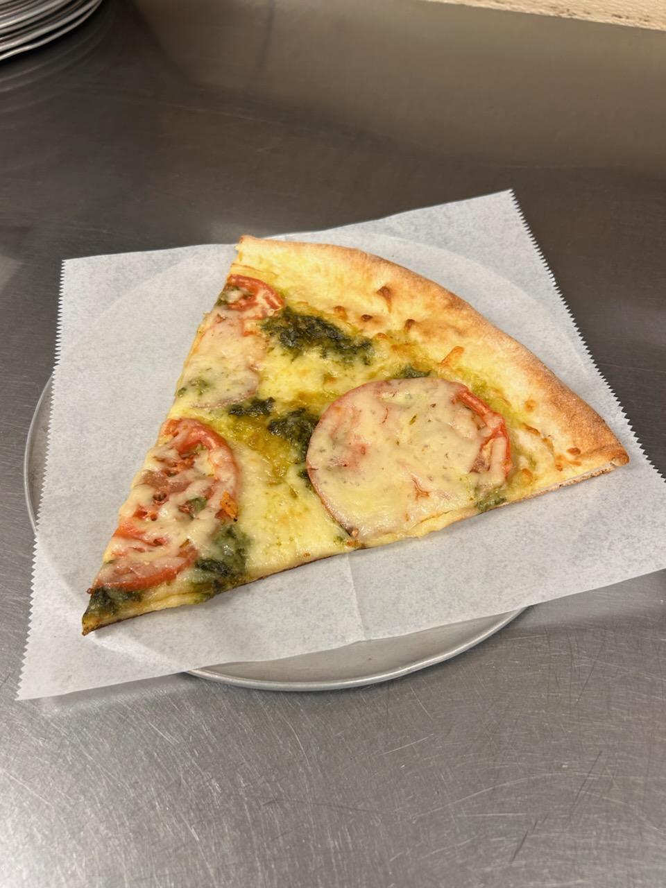 sliced tomato, pesto sauce, mozzarella, grated cheese