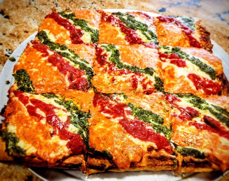 25-30 mins for pick up. OLD FASHIONED BROOKLYN STYLE. SPECIAL MARINARA SAUCE OVER THE MOZZARELLA TOPPED WITH GRATED CHEESE. SQUARE, THICKER CRUST 16" SQUARE 12 SLICES